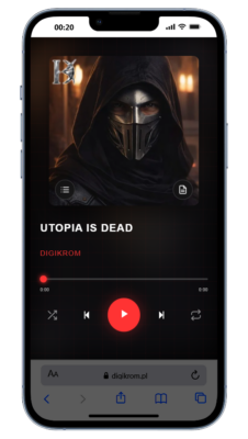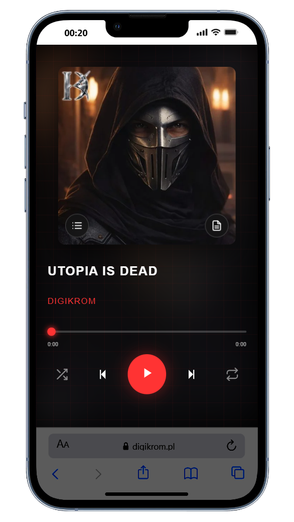 Na smartfonie: Odtwarzacz przejmuje pełną kontrolę. Wypełnia 100% ekranu, pozbywając się nagłówków i menu strony. Przestaje wyglądać jak strona internetowa, a w 100% imituje natywną aplikację mobilną. Posiada wszystkie niezbędne funkcje: tryb losowy (Shuffle), zapętlenie (Repeat) oraz płynne przełączanie między playlistą a tekstem.
