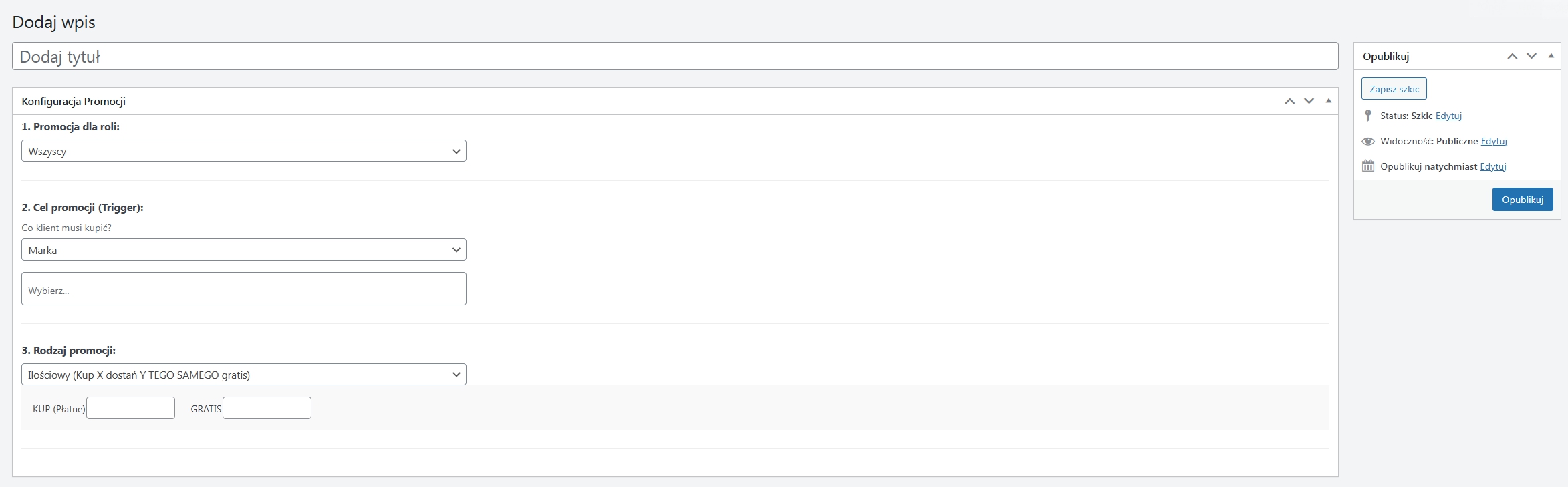 product_brandw WoodMart).[ SEGMENTACJA: B2B vs DETAL ] Promocje nie muszą być dla wszystkich. Możesz je przypisać dla każdego, tylko dla zalogowanych, lub pod konkretne role w WordPressie. Dodatkowo silnik posiada wbudowany, automatyczny rabat (np. -10%) na pierwsze zakupy dla klientów detalicznych z zerową historią zamówień, całkowicie izolując od niego konta przypisane do roli hurtowej (B2B).